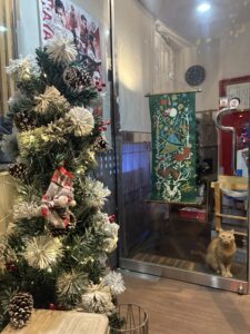 せっかく大通りに店舗を出しているのだから通りを通る皆さんに季節感を楽しんでもらおう!的な気持ちで数日前にクリスマスツリーを飾り、入口の手拭い飾りをクリスマス仕様に変えました🎄
